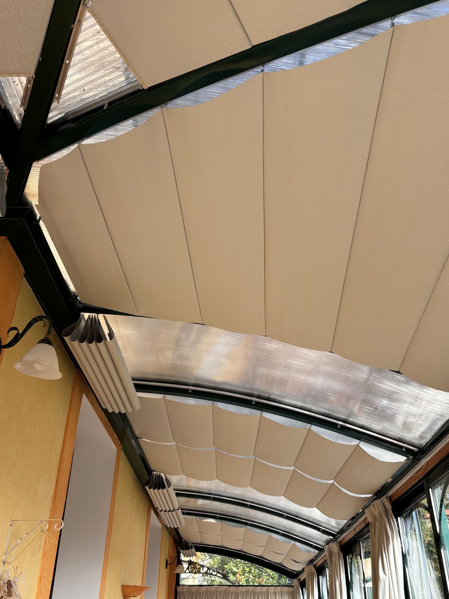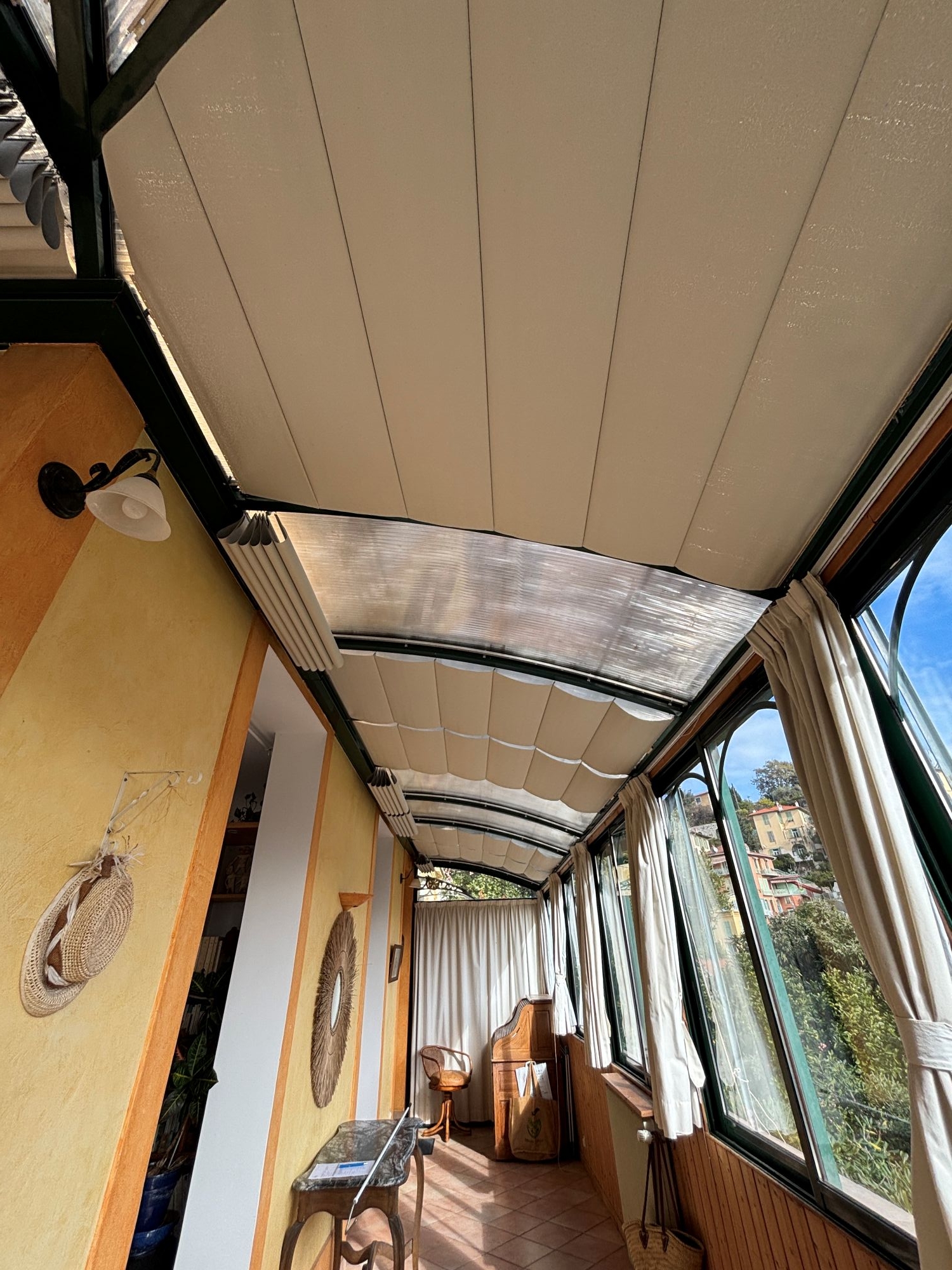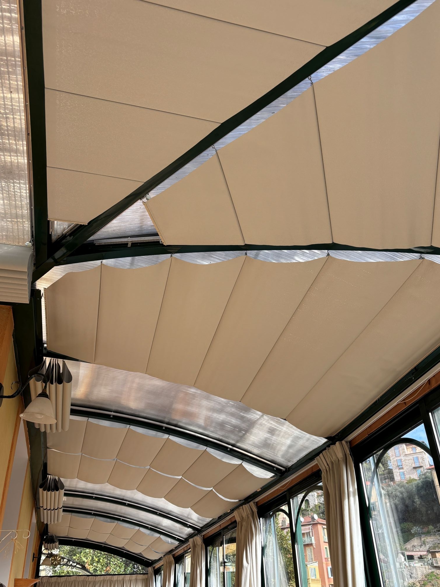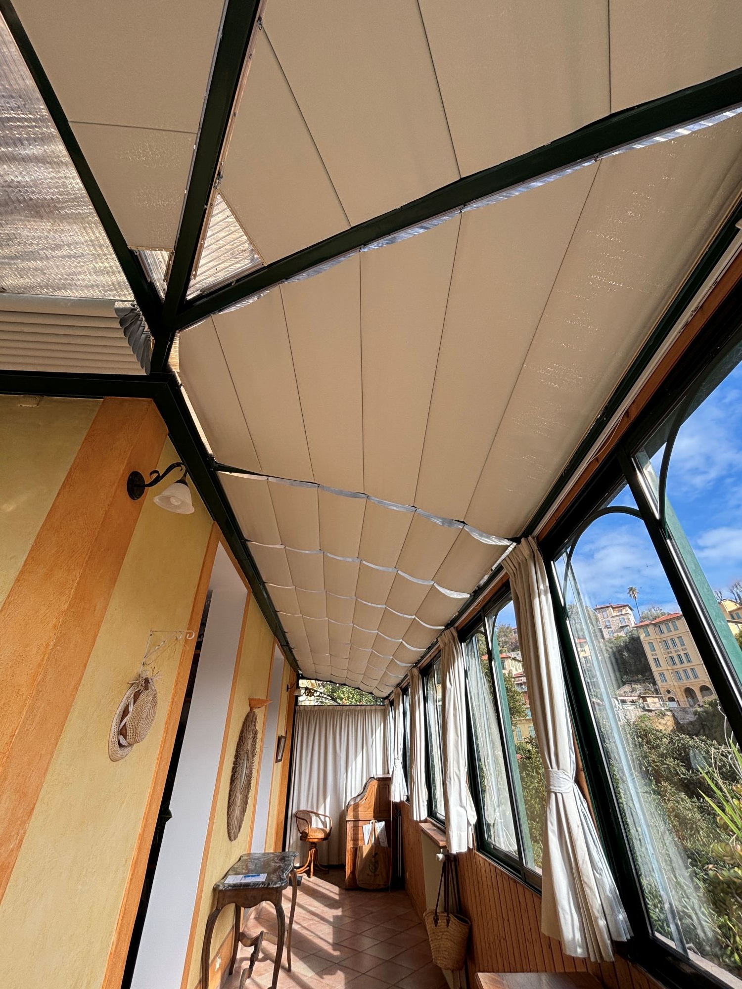 Pour ce projet réalisé à Menton, dans les Alpes-Maritimes, nos clients possédaient une véranda de type verrière cintrée dont l’ancien équipement (toile classique sur rails souples) ne suffisait plus à contrer l’effet de serre. L’enjeu principal de cette extension était de remplacer un mécanisme vieillissant par une solution de protection solaire haute performance capable d’épouser parfaitement la courbure spécifique de la structure.